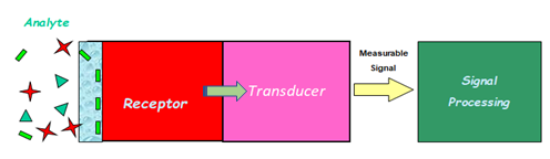 Sensori portatili, altamente sensibili e specifici per una determinata molecola target (analita), si possono realizzare combinando un trasduttore ed un recettore specifico, come rappresentato schematicamente in Figura 1.